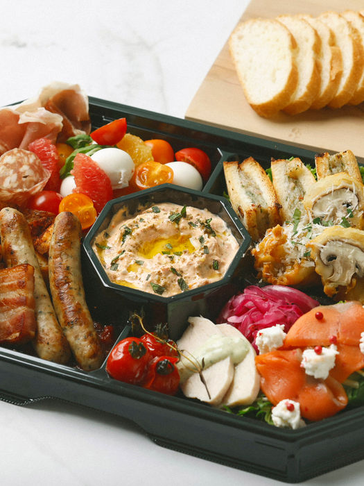 みんなでワイワイ囲めるパーティプレートは、ORTO オールデイダイニング〈THE ALLDAY ORTO〉のシェフが手掛けたもの。店内の工房で作られた新鮮なチーズや、厳選した福岡県産野菜をふんだんに使った多彩なメニューは、お酒のおともにぴったりです。